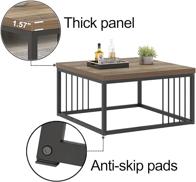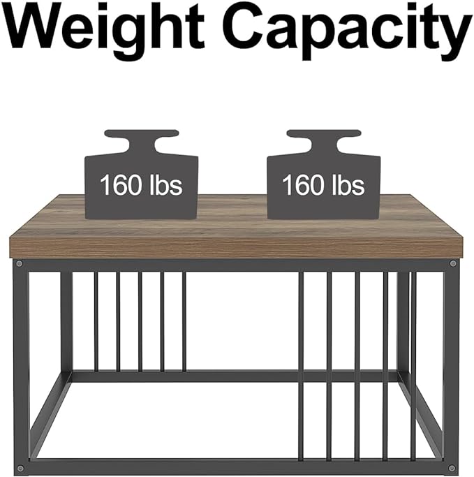 Elevate your living space with this coffee table, boasting a rustic oak wood grain surface and a black metal frame. The vertical lines add a touch of modern industrial charm. Enjoy hassle-free setup with our square coffee table, measuring 80 cm in diameter and 45 cm in height, complete with all necessary hardware and user-friendly instructions. Crafted from high-quality MDF board and a sturdy powder-coated metal frame, this coffee table ensures durability and longevity. Its square structure offers a perfect blend of style and functionality. Designed with a modern-industrial aesthetic, this coffee table effortlessly complements various decor styles. Its minimalist yet stylish appearance makes it a versatile addition to any room, enhancing the overall ambiance.