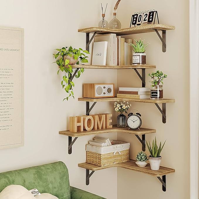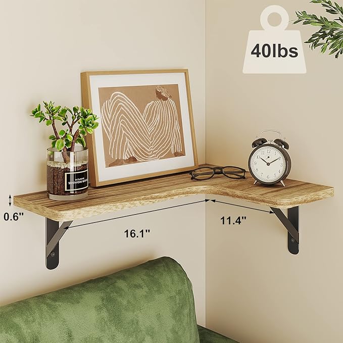 Utilize corner space effectively with our unique arc corner design in carbon black, adding rustic charm to your home while providing ample storage. Perfect for various spaces, our shelves can be used in kitchen, bathroom, bedroom or living room. Board size: approximately 41 x 29 cms, depth: approximately 14 cms, thickness: approximately 1.5 cms, can hold approximatelly 18 kg when installed firmly on the wall. Package includes 5 paulownia boards, 10 metal brackets, 25 plastic anchors, 25 long screws, 25 short screws, 1 bubble level, 1 screwdriver, and 1 installation manual. Made of sustainable and sturdy paulownia wood, our shelves with metal brackets offer great value for money and will last for years. Complete installation in minutes with our easy-to-follow manual. Our wall shelves can hold up to approximately 18 kilograms when installed firmly on the wall.