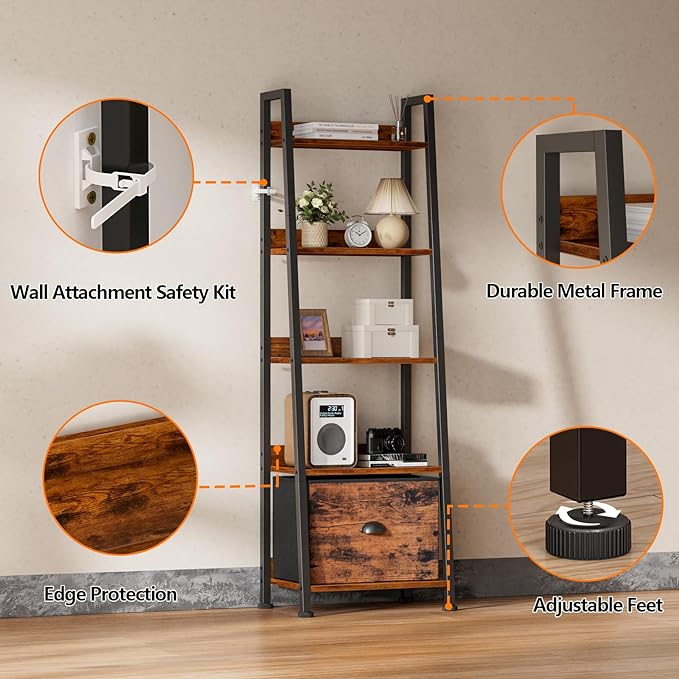 Featuring a removable large fabric drawer, this metal ladder bookshelf pairs with 4 and 5-tier shelves to store books, toys, or personal items, optimizing vertical space. This narrow freestanding shelf serves as a plant stand, bookcase, or storage organizer in various spaces like living rooms, bedrooms, kitchens, or offices. Display artworks or daily necessities with ease. With 3/4 widening boards from top to bottom, this industrial ladder bookshelf offers ample space for plants, photos, books, CDs, or ornaments. Backboards on each shelf ensure items remain secure. Made of high-quality particle board and solid black metal frame, this ladder shelf is waterproof and durable. Adjustable feet keep it stable on uneven floors, protecting surfaces from scratches. Choose from 4 or 5-tier ladder bookshelves in rustic brown, black oak, or white. Dimension: approximately 29 cm D x 42 cm W x 141 cm H.